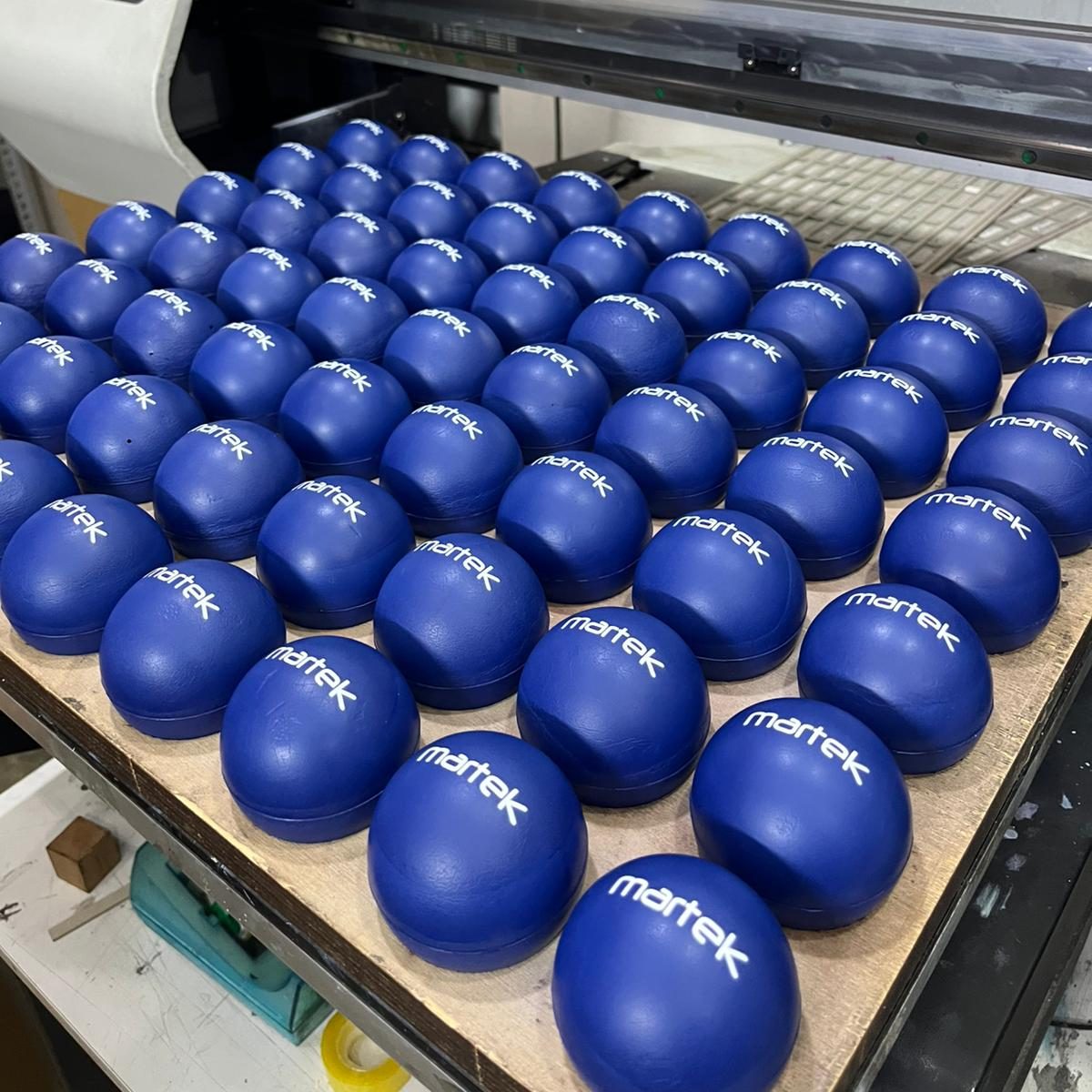 Yuvarlak stres toplarına tek renk veya çok renkli UV baskı uygulanmaktadır. Baskılar ön ve arka olmak üzere çift yönlü yapılabilir.